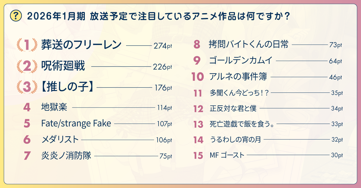 「2026年1月期 放送予定で注目しているアニメ作品は何ですか?」と尋ねたところ、1位は『葬送のフリーレン』(274pt)、2位は『呪術廻戦』(226pt)、3位は『【推しの子】』(176pt)となりました。