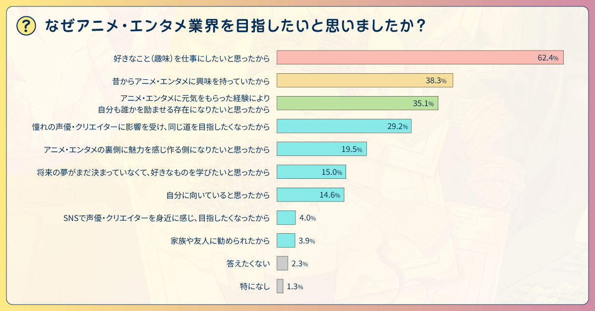 アニメ・エンタメ業界を目指した理由について尋ねたところ、「好きなこと(趣味)を仕事にしたいと思った」との回答が62.4%となり、他の選択肢を大きく上回る結果となりました。
