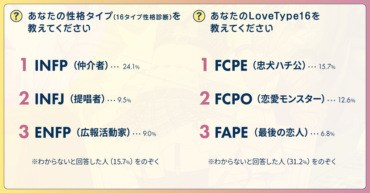 MBTIで多かったのは「INFP(仲介者)」 LoveType16では「FCPE(忠犬ハチ公)」