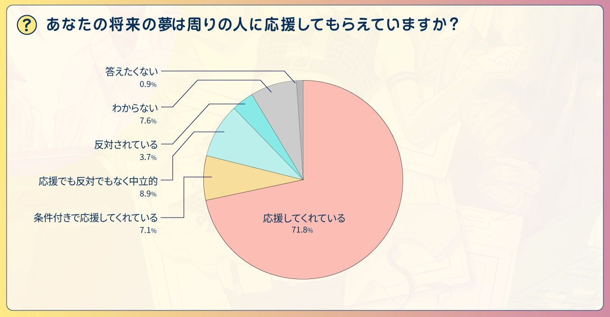 「あなたの将来の夢は周りの人に応援してもらえていますか?」と尋ねたところ、「応援してくれている」との回答が71.8%、「反対されている」との回答が3.7%といった結果になりました。