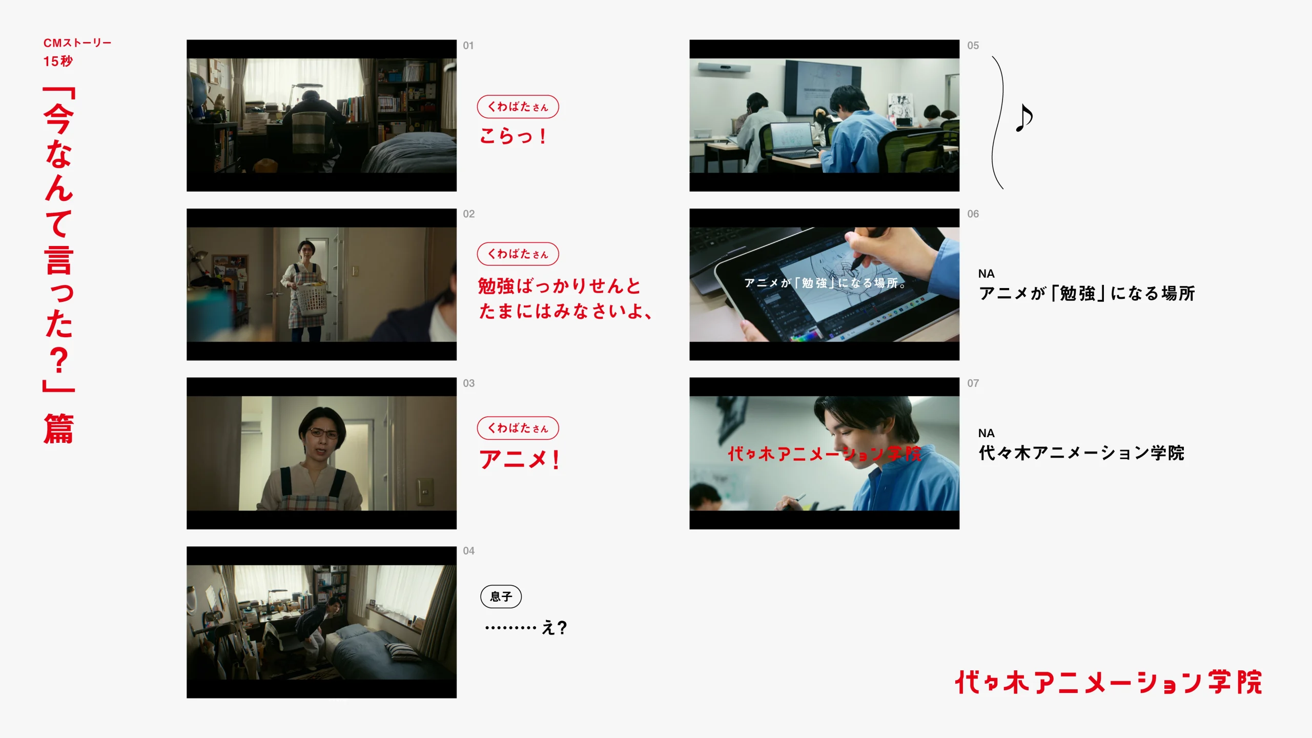 本CMでは、アニメに夢中になる男子高校生と、それをなぜか大絶賛する母親役のくわばたりえさんとのコミカルな掛け合いを通じて、「アニメが「勉強」になる場所」という代々木アニメーション学院の魅力を伝えるCMとなっています。